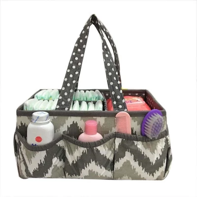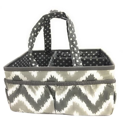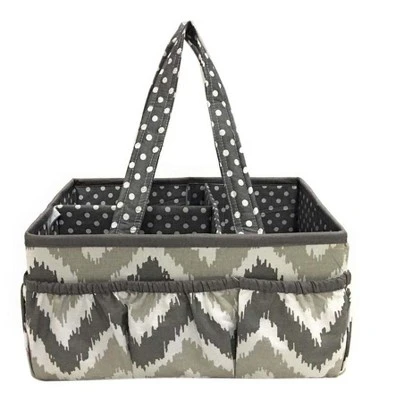 Add organization to any area of your home with the portable Nursery/Toddler Storage Caddy by Bacati. Perfect for dressers and changing stations, this lightly padded caddy has 8 outer pockets and a removable “T” separator for maximum versatility. The soft cotton percale fabric with stiffner inside keeps the shape intact, lining and handles feature a padded with polyfilled and cordinating trim. Keep diapers, wipes and other necessities tidy while traveling from room to room. Caddy also functions as an organizer for crafts, picnics, pet supplies, etc. Measures 12.5 in x 6.25 in x 8.5 in.