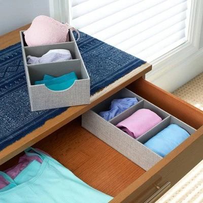 This organizer tray set is not only offered in a pack of 2, but the 3 compartment feature also allows for greater forms of storage and organization. Even though these 2 organizer trays come together, they can be used side by side or separately in different locations in your home as well. Arranging and storing items such as socks, nylons, ties, underwear, makeup, bras and other accessories will be made easy with the use of this tray. Made of stylish gray blended fabric, this organizer tray possess a soft and natural quality, which will be gentle on the traysโ contents as well as the surface on which it sits. A hardsided frame supports the tray without adding significant weight. Use each organizer tray to tidy up areas of your house, such as a bedroom, closet, bathroom, officeโany room that could use a stylish organization addition. The traysโ low-profile design is perfect for the inside of a drawer, but would also fit nicely on top of a desk, countertop, dresser drawer or closet shelf. The 3 compartments in each tray help separate the items inside, whether theyโre pieces of jewelry, makeup or office supplies, or clothing accessories like scarves, socks, jewelry, bras, underwear, tights, ties or other delicate items. These 3 compartment organizer trays will make your daily tasks noticeably more efficient. This tray will keep all of your accessories and other items in one organized place, all while adding stylish charm.