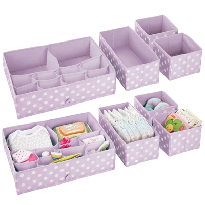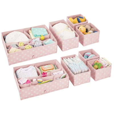 Create customized storage with this fun Fabric Storage Organizer Set from mDesign. Place organizers in drawers, closets or on top of dressers and changing tables. The various sizes fit all of your little one’s essentials, and makes it easy to find and grab what you need right away! The 10 section organizer holds smaller items like hats, socks and shoes, hair bands and other small accessories, while the open compartment organizer can hold larger items like powders, lotions, soaps, diapers and books.