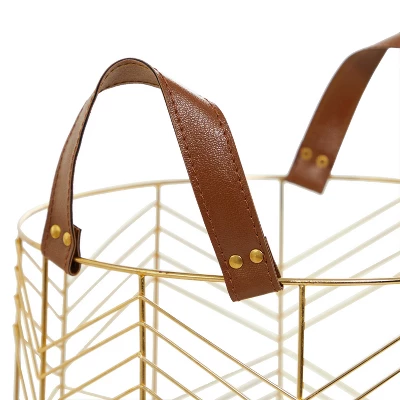 Organizing isn’t boring when you have amazing storage baskets to fill. Keep your space tidy and neat with the help of these storage baskets. Store your belongings or laundry with these storage baskets that adds a hint of glam in your bathroom, bedroom, or living room space. This item ships in 1 carton. Suitable for indoor use only. This item ships fully assembled in one piece. Leather and hair on hide are natural products, and therefore no two will be alike. There may slight variations in pattern, natural blemishes, colors, and overall aesthetic of the product. Maximum weight limit is 5 lbs. Made in India. This gold colored basket organizer comes as a set of 3. Glam style.