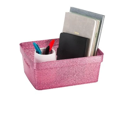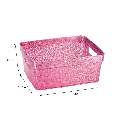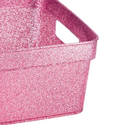 Organize and create storage in your home with the Simplify 3 Pack Small Glitter Totes. They are strong andΒ durable, and the lightweight design makes it easy to lift and carry. The size makes these a great addition to a countertop, shelf, closet or in a deep draw. They are perfect for storing toys, office supplies, cleaning supplies, accessories and so much more! Your space with look neat and organized with the set of matching totes.