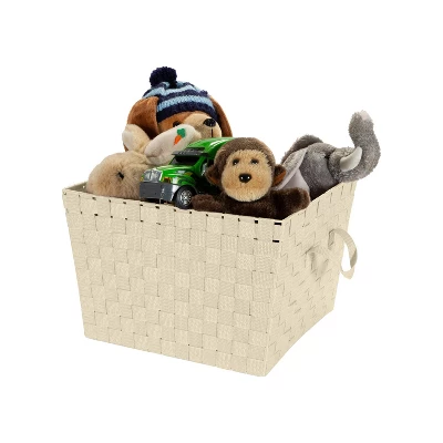 Stay organized with this convenient Woven Strap Tote. These baskets are ideal for storing many types of household items. The 100 percent polyester woven storage tote is available in various sizes to suit your home decor or personal preference. Choose from an assortment of colors. Each basket features tear-resistant construction ensuring long-lasting durability.